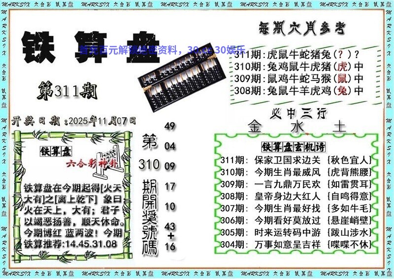 | 312期:五尾中特『1.4.5.7.8』开:發00中 |